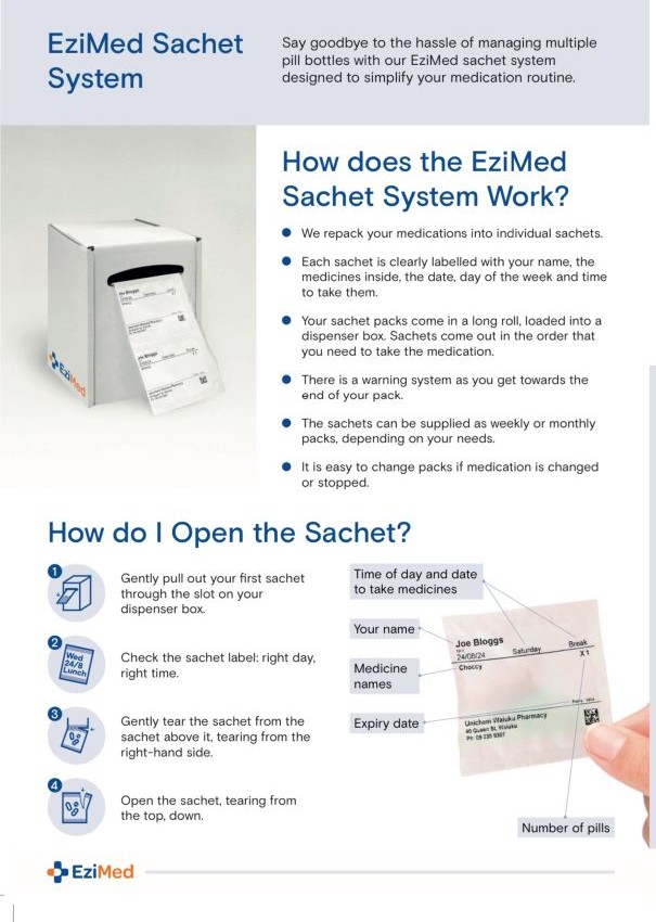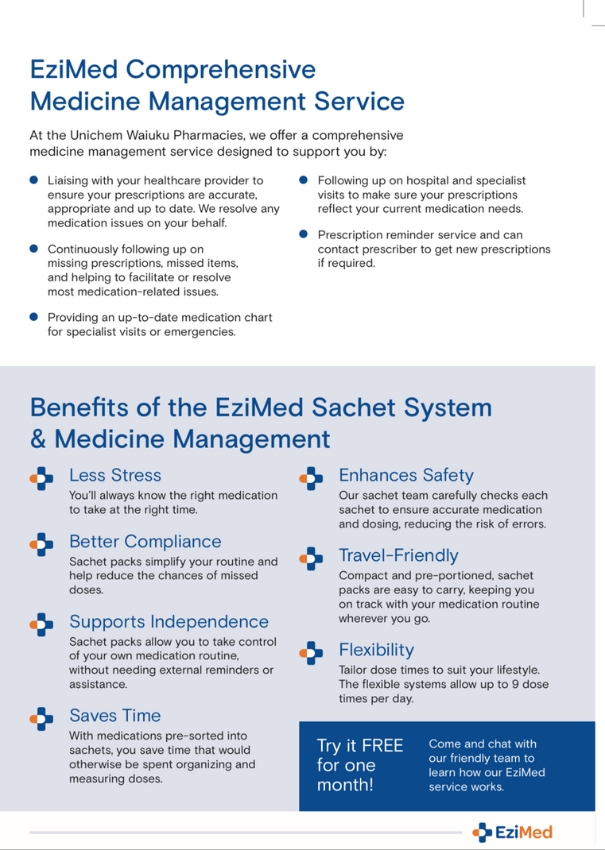 Unichem Waiuku understands that managing your medication can be overwhelming. We are here to support you with our EziMed sachet system and our comprehensive medication management service.